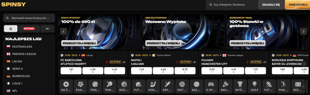 - Spinsy – serwis oferuje rozbudowaną sekcję zakładów sportowych oraz atrakcyjny pakiet powitalny, w którego skład wchodzi bonus 100% od depozytu do 450 PLN. Regularne promocje, takie jak boosty kursów czy darmowe zakłady, pojawiają się tu bardzo często.