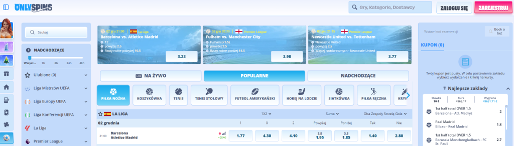 - OnlySpins – platforma, która proponuje bardzo szeroką ofertę zakładów sportowych. Znajdziesz opcje obstawienia najpopularniejszych sportów, jak piłka nożna, ale także mniej rozpoznawalnych dyscyplin. Nowi użytkownicy mogą liczyć na bonus od pierwszego depozytu, dostępny również w wersji dla graczy korzystających z kryptowalut.