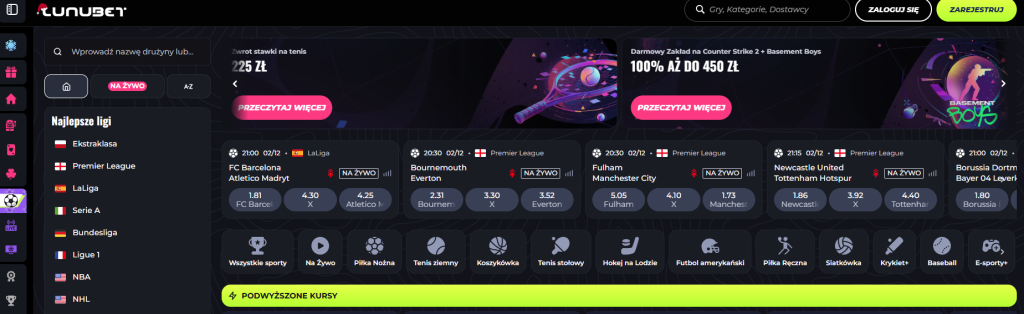 Platforma jest bezpieczna i stabilna, co skrupulatnie przetestowali nasi eksperci. Po rejestracji otrzymasz bonus powitalny, który podwaja pierwszy depozyt aż do 450 PLN. Lunubet prowadzi również regularne promocje dla aktywnych graczy, jak bonusy reload, kursowe doładowania, zakłady bez ryzyka, AKO oraz cashback.