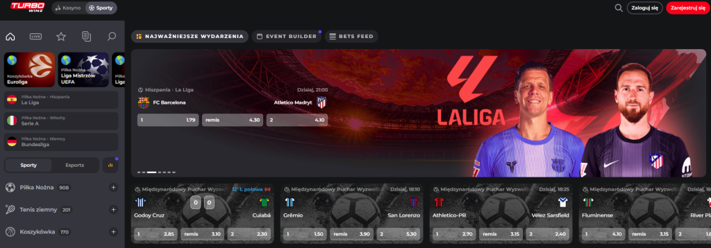 - Turbowinz – operator łączący dynamiczną platformę do zakładów z licznymi promocjami dla stałych graczy. Nowo zarejestrowani typerzy otrzymają ofertę powitalną w postaci bonusu 100% do 450 PLN, a następnie mogą korzystać z cotygodniowych cashbacków i dodatkowych akcji na wybrane ligi.