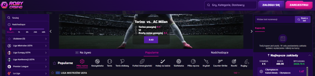 Jeśli chodzi o ofertę zakładów, Roby prezentuje bardzo wysoki poziom. Oprócz standardowych zakładów sportowych, dostępne są też sporty wirtualne i e-sport, co zapewnia szeroką gamę możliwości.